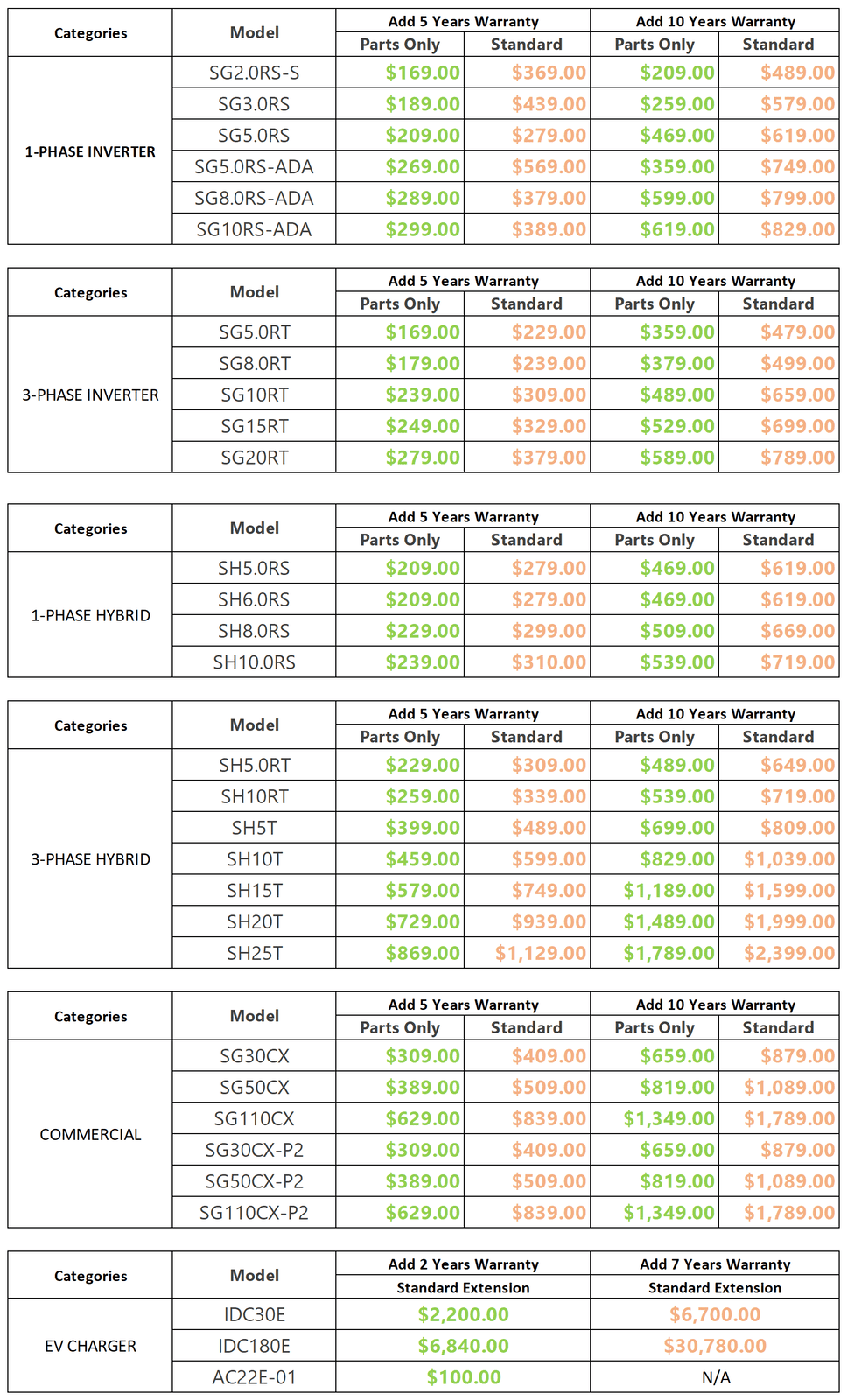 Warranty extension grants the inverter an additional warranty year up to 10 years of parts or standard warranty(for special requirements, please contact our sales team), as described below: